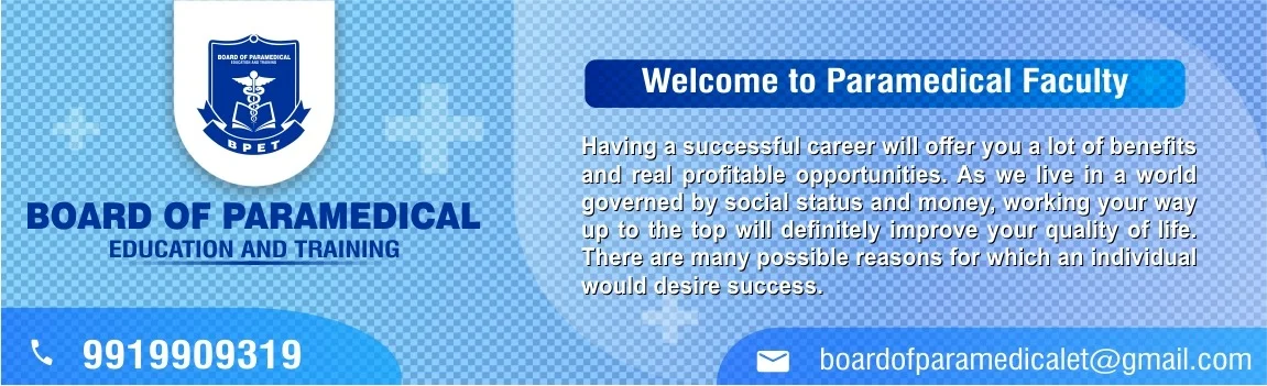 Board of Paramedical Education & Training was established on 2021 and Registered under Indian Trust Act 1882 and Also Registered with MSME Registration No. (UAN) UDYAM-UP-50-0029898 (Ministry of Micro Small and Medium Enterprises Govt. of India). Board of Paramedical Education & Trainingalso registered with NITI AYOG having Unique ID - UP/2021/0295723 . This body working under its own constitution.By laws to assure and promote the quality in the Para Medical Courses. The Faculty conduct the Examinations, issue diploma certificates and registration to deserving candidates, The Faculty Affiliation the institutes and issue norms, standard and guidelines itself to regulate the field of Para Medical Education. The Govt. accords prime importance to the public health. The health of the people depends primarily on adequate nutrition, health education, proper arrangement for the prevention of disease and proper facilities for the care and cure of sick persons.